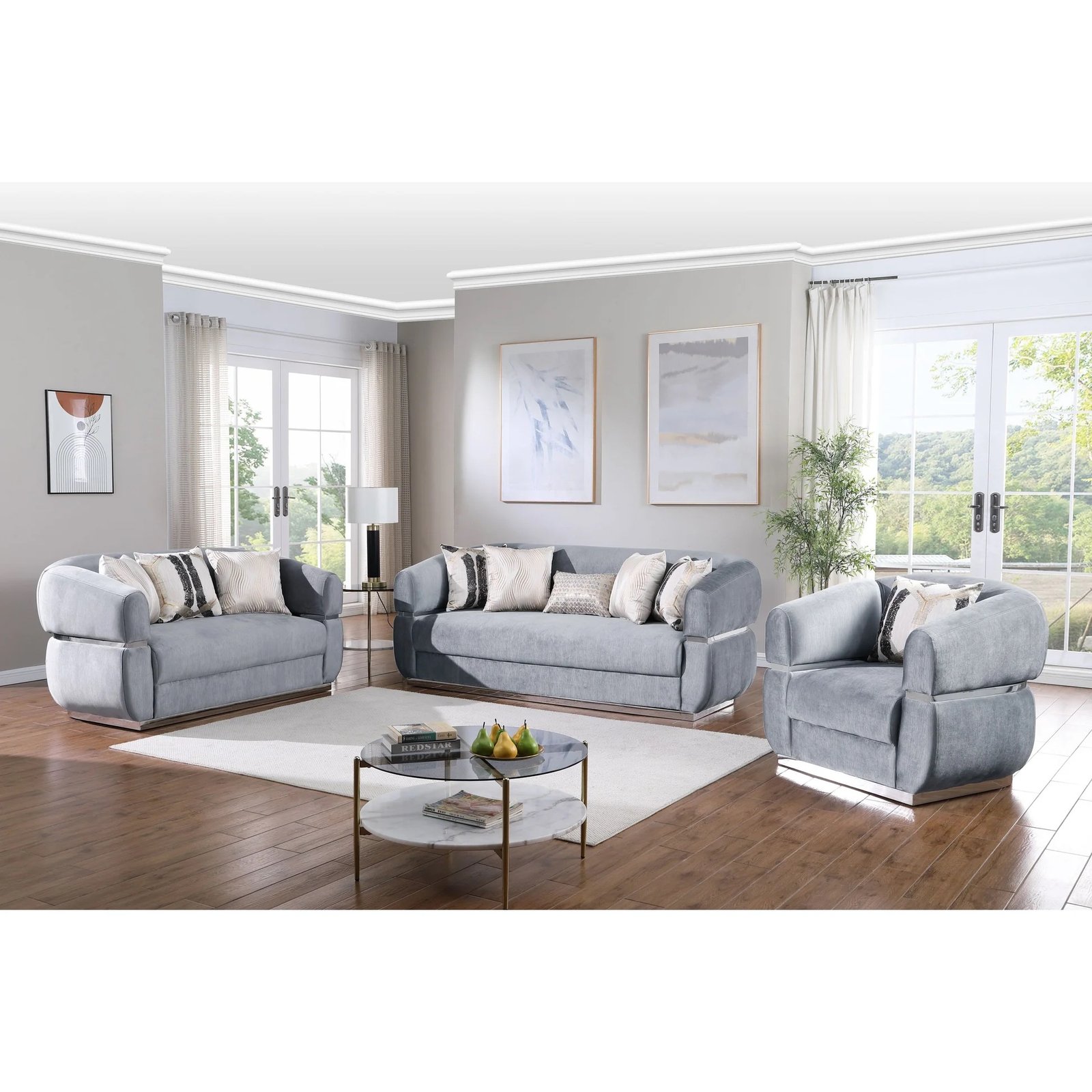 Elevate your living space with the S3300 Carmela set in sleek grey velvet. This elegant collection includes a sofa, loveseat, and chair, each designed for both comfort and style. This set adds a luxurious touch while providing a soft, inviting feel. Perfect for creating a cozy yet sophisticated atmosphere, the S3300 Carmela ensures lasting comfort and timeless appeal in any room.