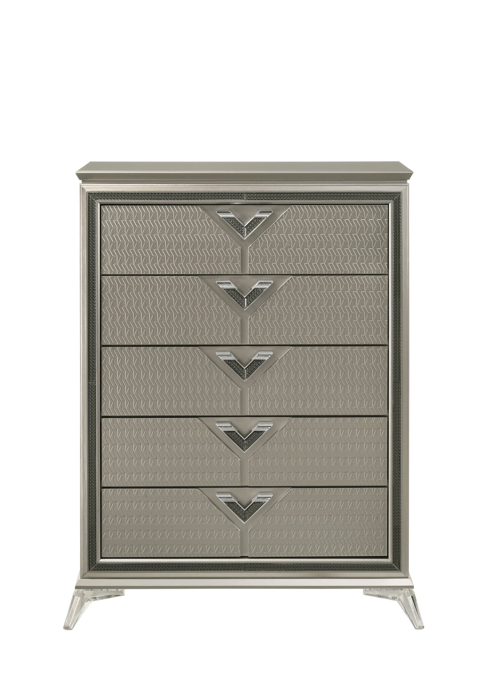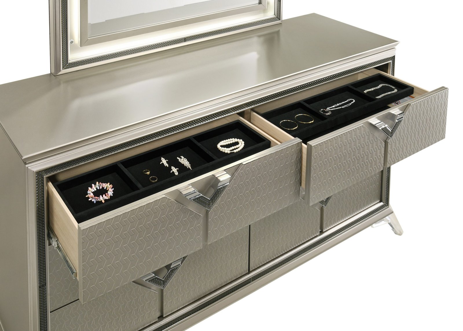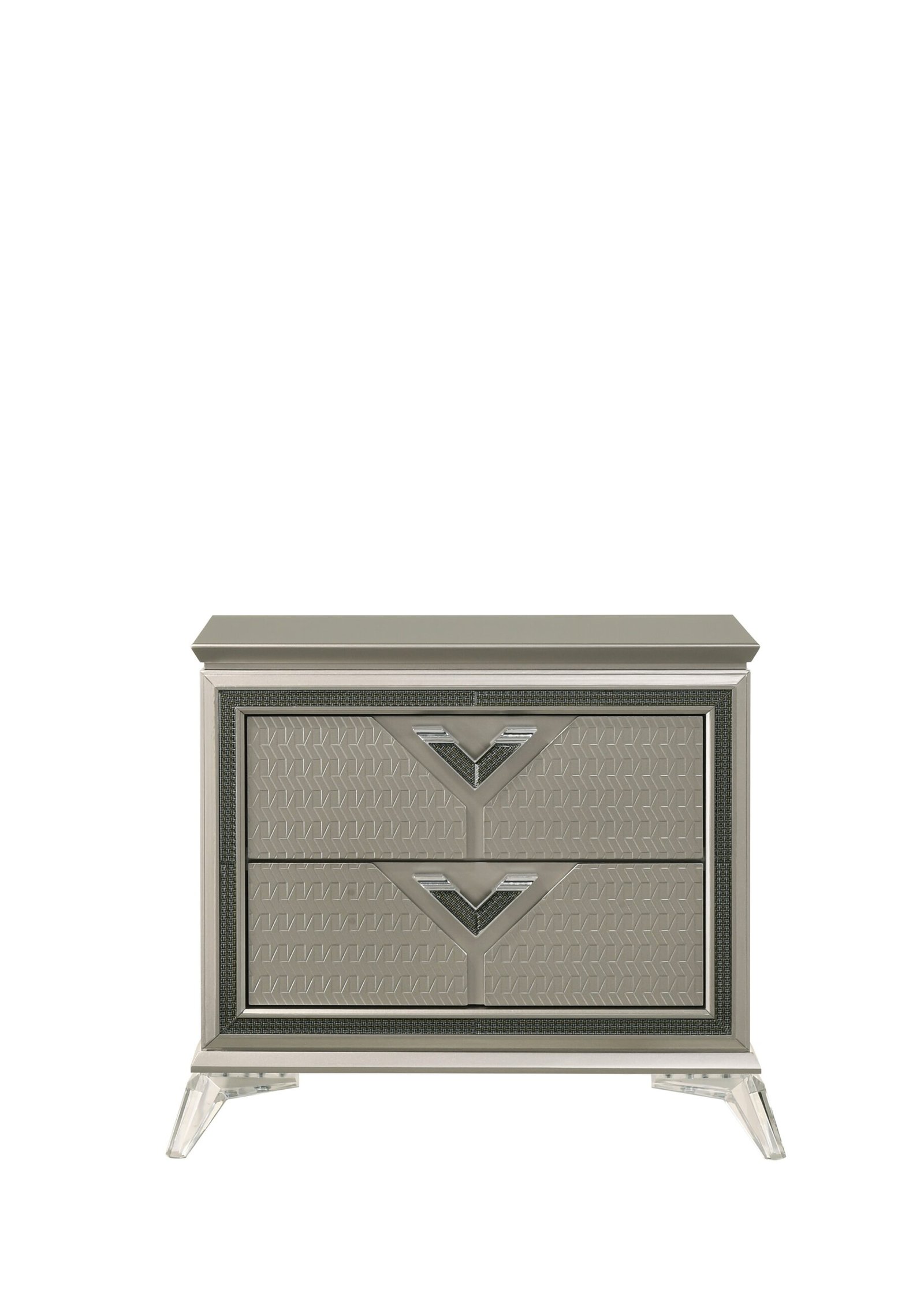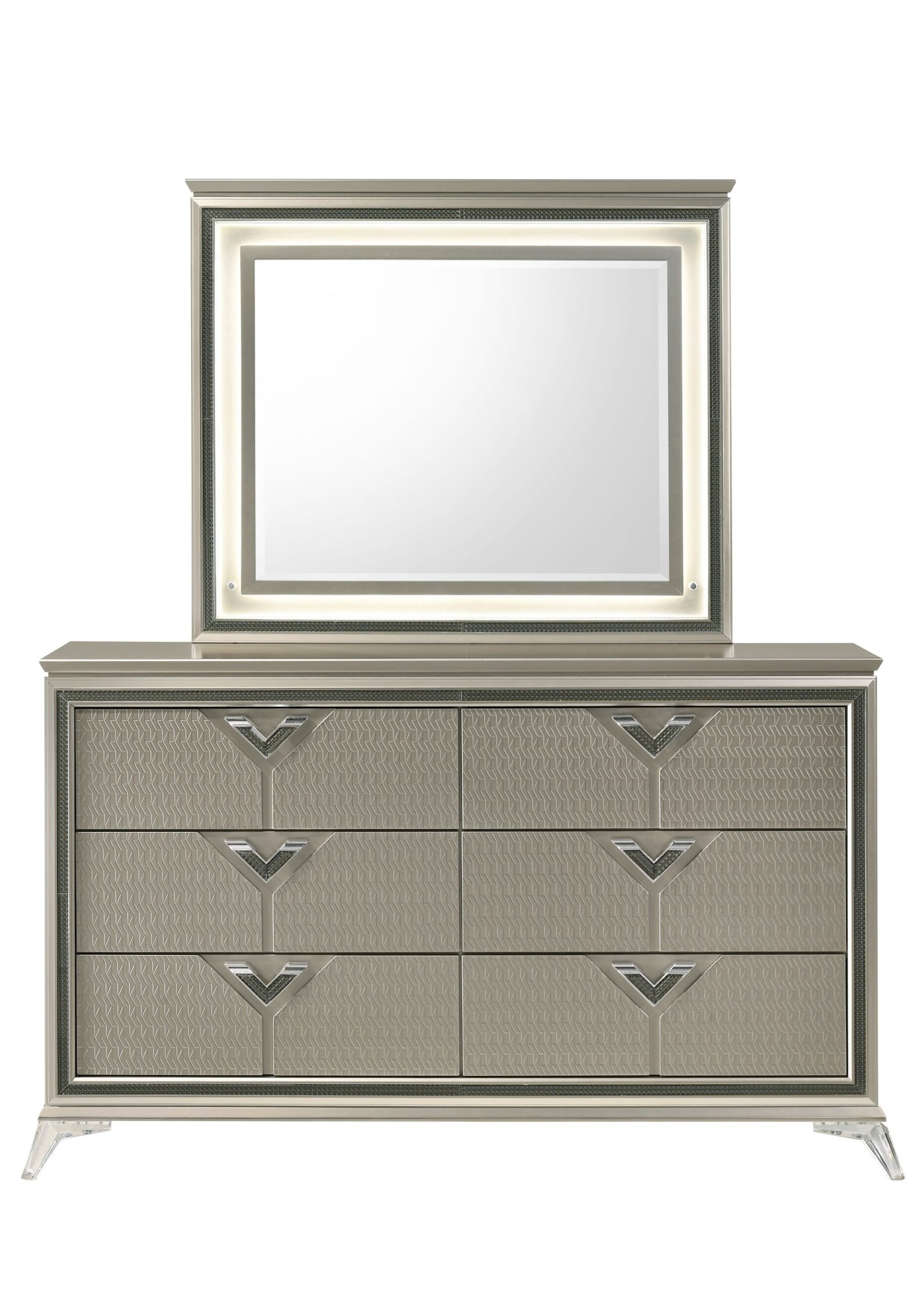 Features: Diagonal grain embossed panel at drawer front only, Headboard & Mirror with LED, Acrylic bun-feet at the front & metal legs at the back, Jewelry box, Decorative black-silver fiber glass on front frame, Nightstand w/USB & Type C, Ball bearing glides, Upholstered grey soft fabric headboard and Box Spring needed.