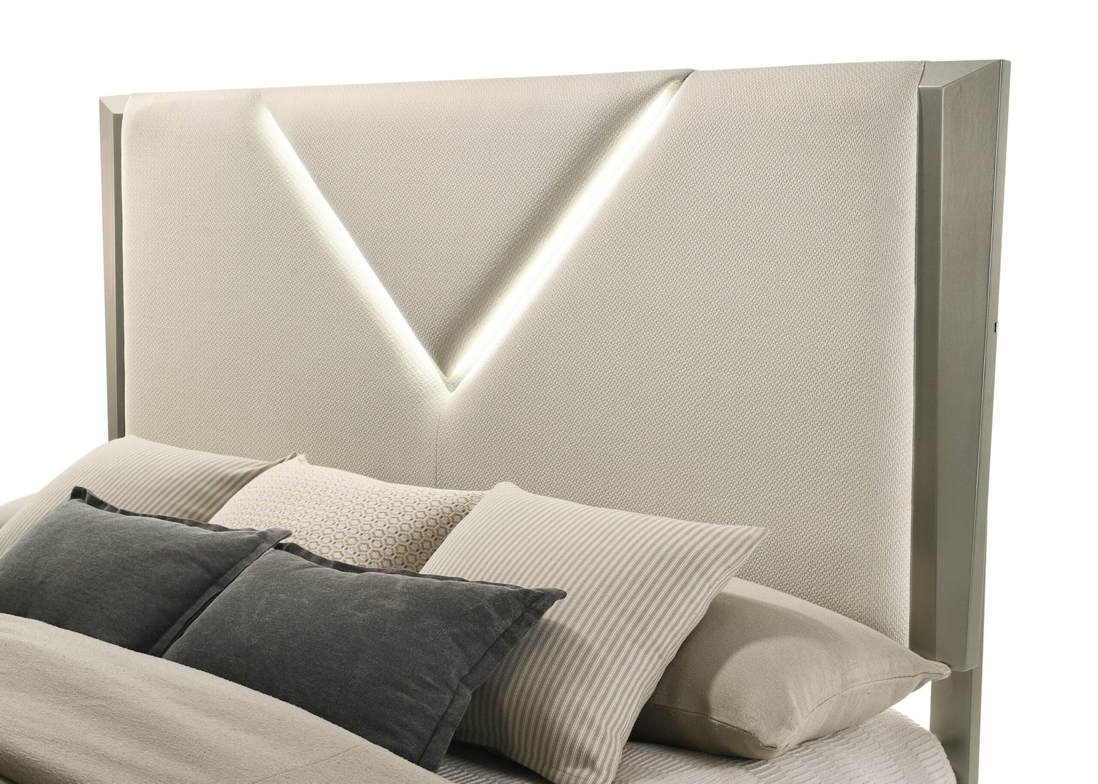 Elevate your bedroom with the B6700 Amiri in Silver Ice—a modern bedroom set designed for style and convenience. The upholstered grey fabric headboard offers comfort, while the illuminated mirror with LED lighting creates the perfect ambiance for your morning routine. Textured details like the diagonal grain embossed drawer front and decorative black-silver fiberglass frame add sophisticated visual depth. Practical features include a built-in jewelry box, dual charging ports (USB and Type C) on the nightstand, and smooth ball bearing glides for seamless drawer operation. Acrylic bun-feet at the front and metal legs at the back provide stability with refined aesthetics. This thoughtfully designed set combines functionality with contemporary appeal.