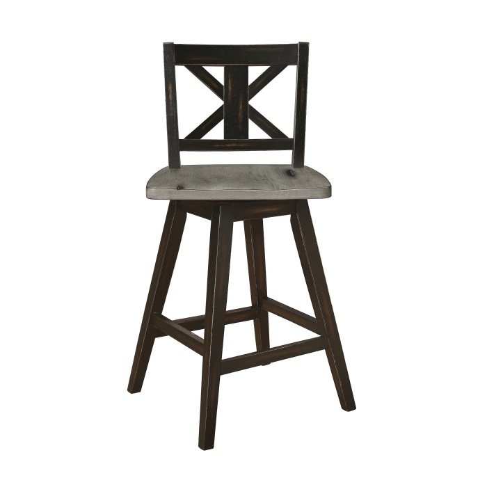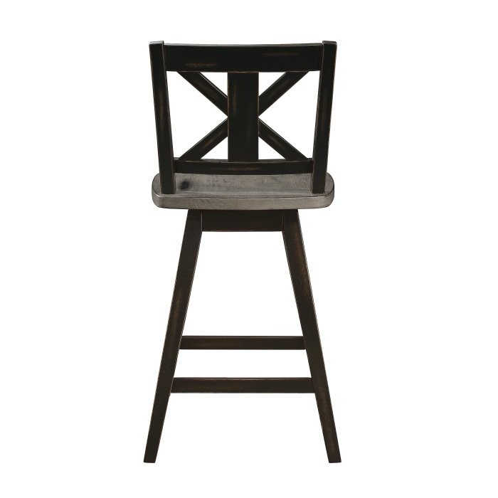 Creating a subtle rustic look for your dining space is the Amsonia Collection. A black sand-through finish graces the solid rubberwood 24-inch swivel X-back counter height chair, highlighting the veneer.