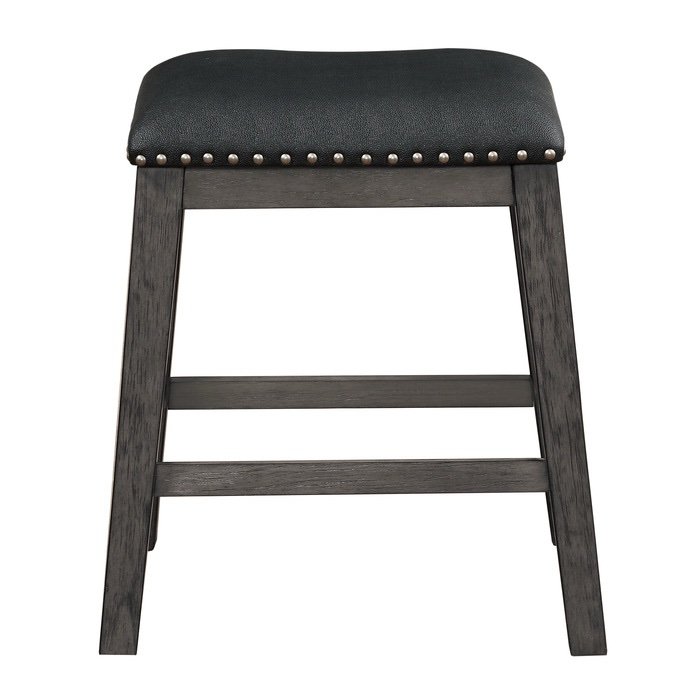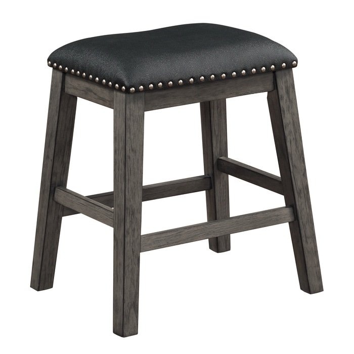 The design of the Timbre Collection will be the perfect seating addition to your casual dining space. The counter height barstool’s legs feature wire-brushed acacia veneer that is highlighted by a grey finish. Topping the stool is the textured black faux leather seat with nailhead accent. Coordinating dining table is also available.