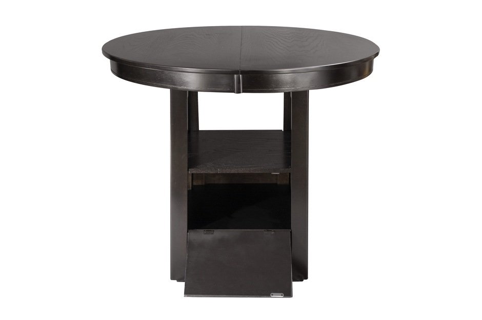 Utilizing the traditional elements of mission styling, the Junipero Collection adds the feel of the early 20th Century design movement to your casual dining room. The pedestal table base supports an oval top and features storage accessible behind the drop-panel door. Framing, unique to the classic style, carries from the chair backs to the table base. The dark cherry finish serves to highlight the wood veneer.