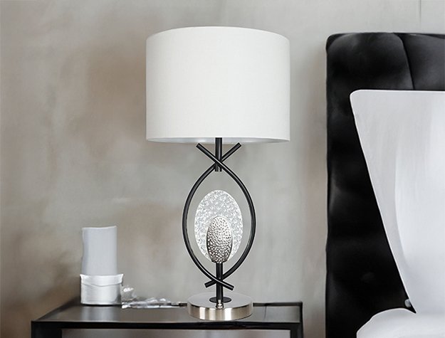 Elevate your decor with a striking combination of modern artistry and functional elegance. This exquisite table lamp showcases a unique intertwining metal frame that exudes sophistication and visual intrigue. At its heart, a sparkling crystal accent and textured metallic centerpiece catch the light, creating a mesmerizing play of reflections that adds a touch of glamour to any room. The sleek circular base and soft, cylindrical fabric shade provide a harmonious balance, delivering warm and inviting illumination. Perfect for bedside tables or accent pieces, this design is a statement of refined taste and timeless style.