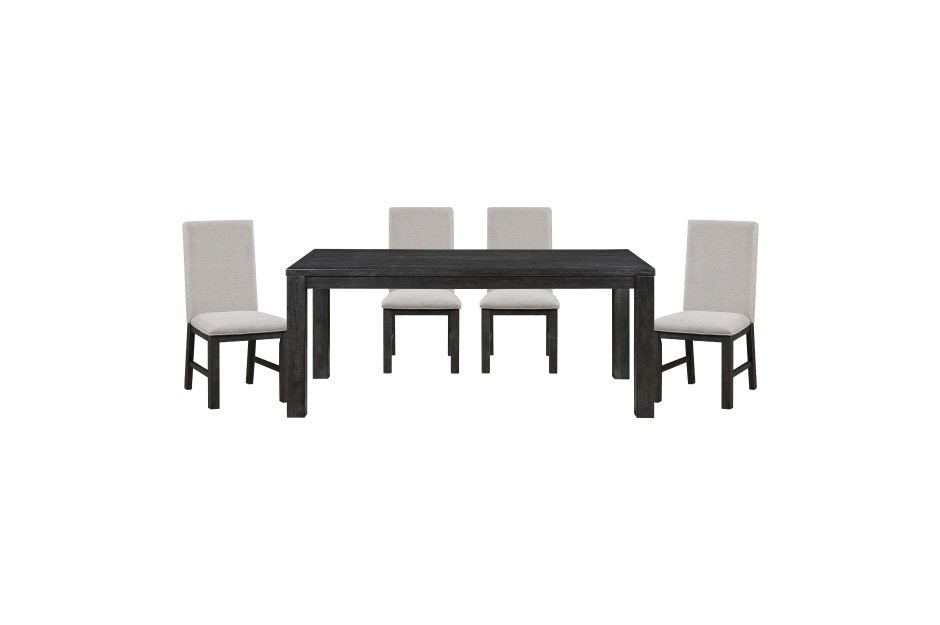 The transitional framing of the Orem Collection will provide a perfect mealtime platform for your casual dining room. The antique black finish of the collection’s oak veneer creates a versatile decorative accent to your space. Gray fabric upholstery covers the seats and backs of the wood leg-supported side chairs. Providing storage space within your dining room is the coordinating server. Drawers and behind door shelving allow for in-room storage of your tabletop decorative items and soft goods. A removable wine rack along with wine glass storage furthers the unit’s functionality.