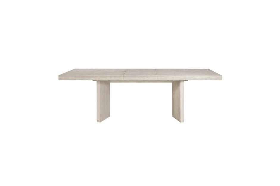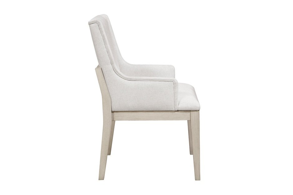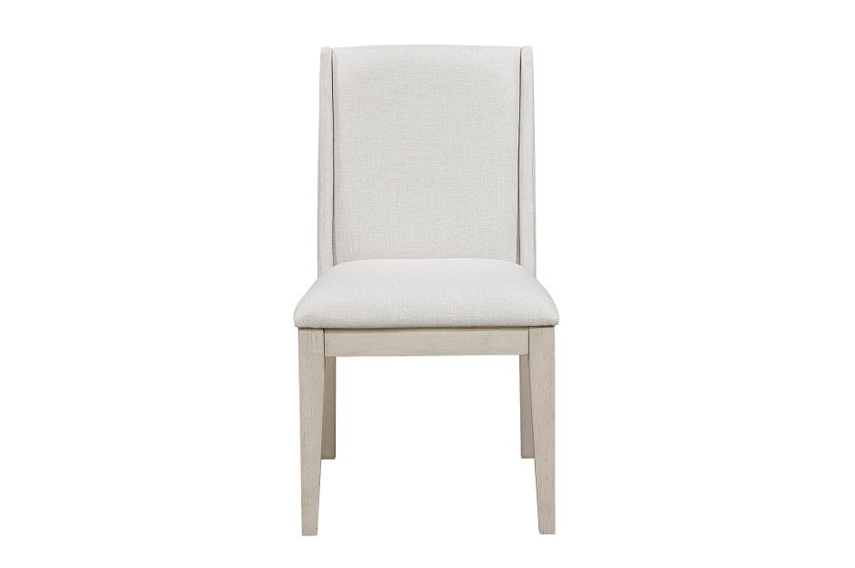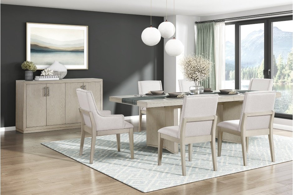 Host large family dinners with this versatile transitional dining collection, anchored by a table that extends effortlessly with a removable leaf. The entire set is finished in a beautiful antique white over durable birch and oak veneer, offering a light, airy, and sophisticated aesthetic. Upholstered chairs feature comfortable textured fabric and the coordinating server provides ample storage, making this collection a high-value centerpiece for any formal or casual dining room.
