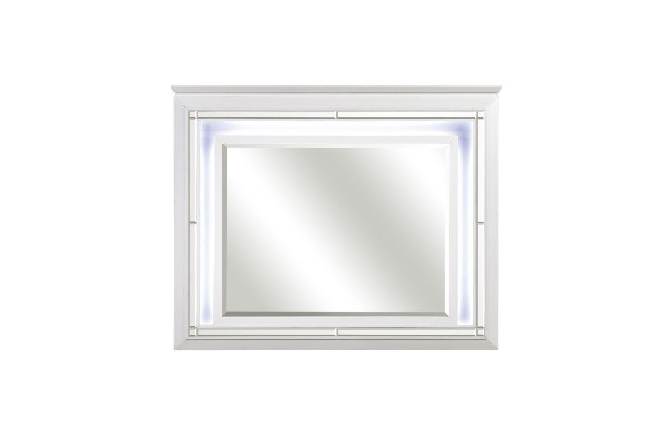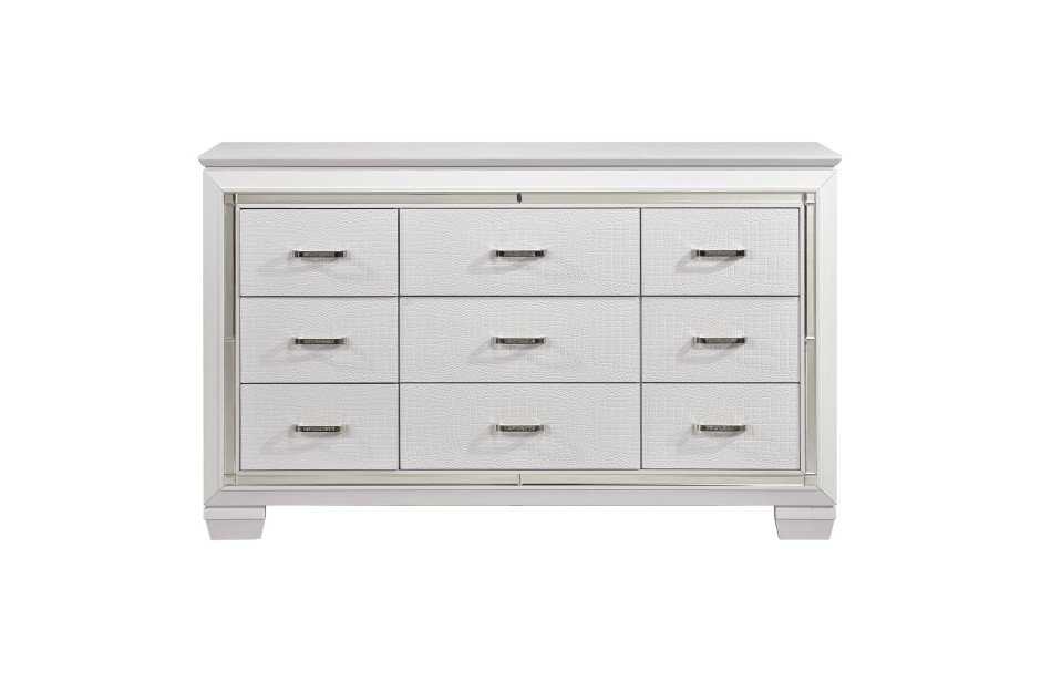 Glamour reigns in the design of the Allura Collection. Framing the Eastern Queen – King bed is a decorative beveled mirror accent that enhances the illumination from the touch-engaged LED backlight of the headboard. Alligator embossing and high polished crystal-enhanced hardware boldly accent the white finish as does the pearl-white faux leather crystal-tufted headboard insert.