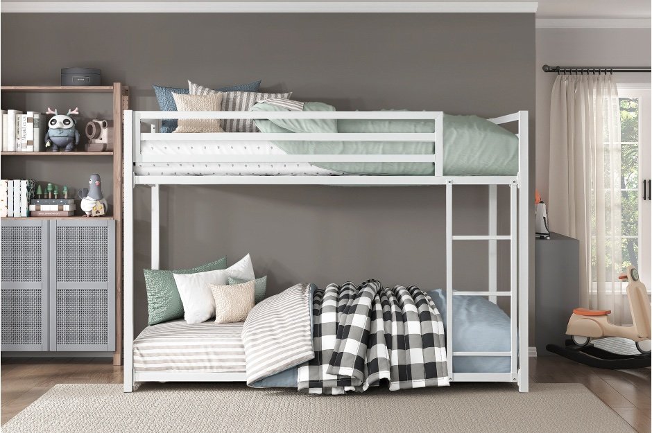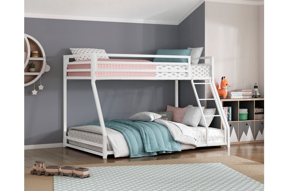 The Jovie Collection provides a creative sleep space solution for your children’s bedroom. The ground-level platform of the optional twin-over-twin or twin-over-full bunkbed is a unique twist on the look of the stacked bedroom staple, making bedtime a breeze, while calling dibs on the top twin bunk is made easy with the mounted ladder. Constructed of metal framing and finished in white, the bunkbed is a neutral canvas for the creative stylings of your children’s wildest dreams.