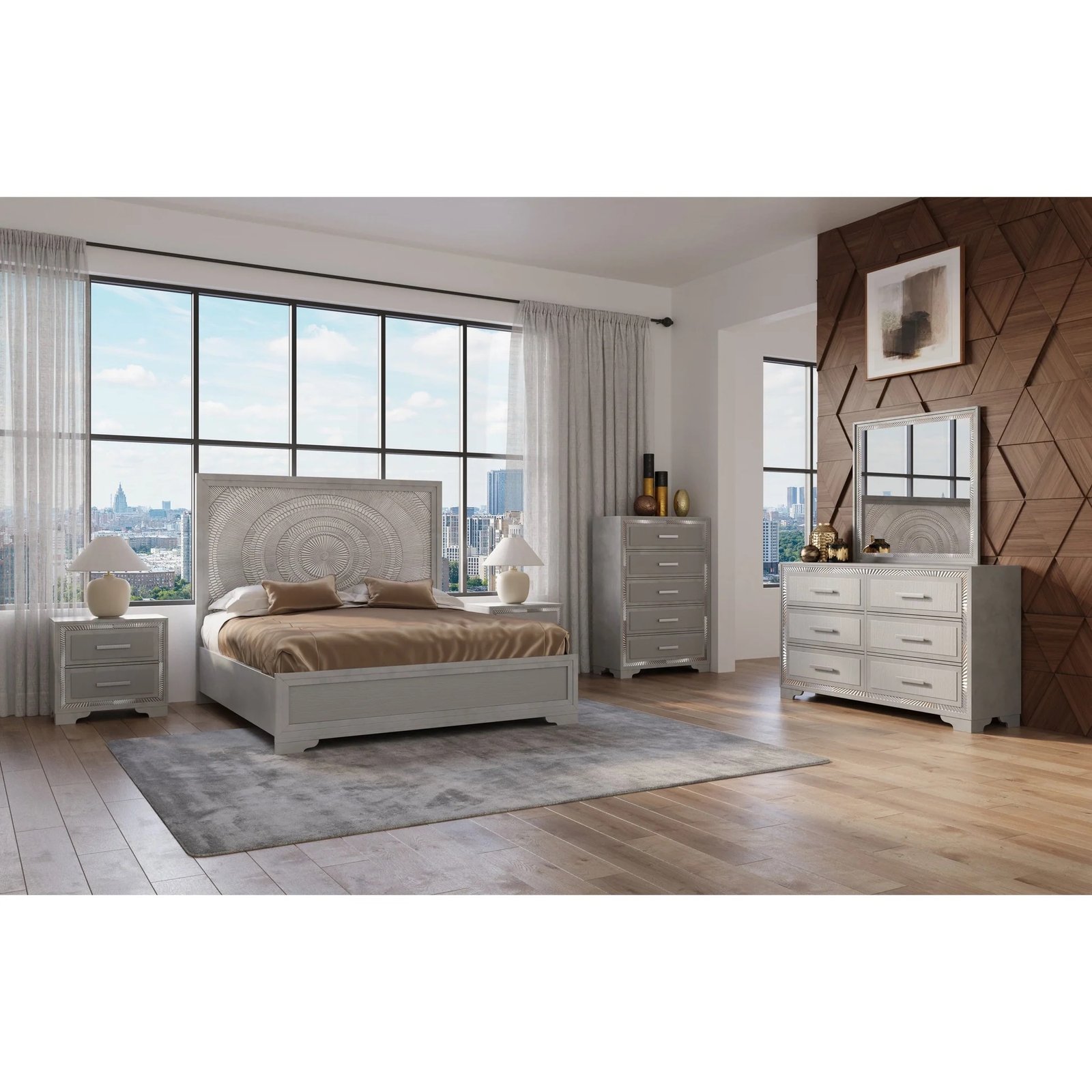Bedroom set includes bed frame, dresser, mirror, and nightstand.
